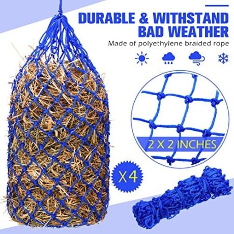Nuenen 4 Pcs Slow Feed Hay Bag 40 Inch Hay Nets for Horses Hanging Hay Feeder for Goats 2 x 2 Inch Mesh Holes Horse Hay Bag Horse Feeding Supplies for Trailer and Stall, Simulates Grazing (Blue)
