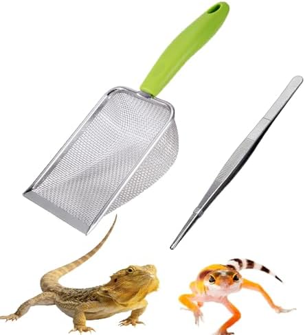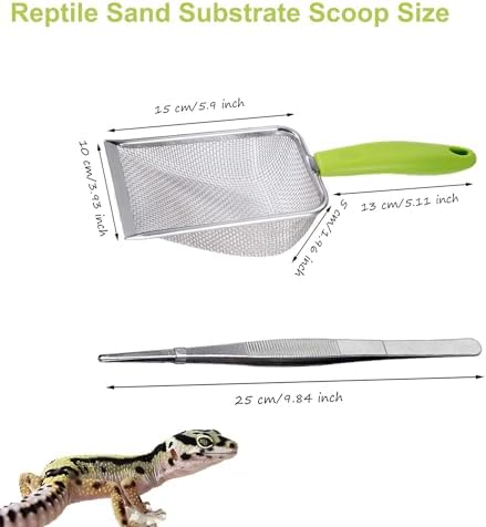 Reptile Sand Substrate Scoop Reptile Sand Fine Mesh Reptile Scooper Stainless Steel Terrarium Substrate Sand Bedding Litter Cleaner Scoop and Reptile Long Feeding Tongs Set (Green-2mm)