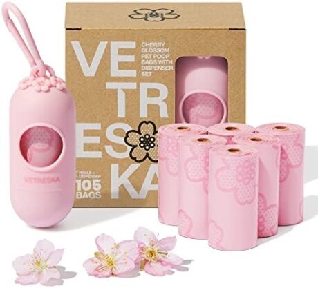 VETRESKA Dog Poop Bag Dispenser with Cherry Blossom Scented Bags, Leak Proof, Extra Thick Waste 1 Count Holder and 105 Bags for Walking Cats Litter, Pink