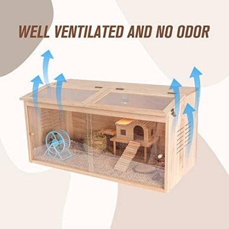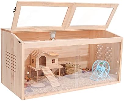 Wooden Hamster Cage, Animal Cabinet for Dwarf Syrian Hamsters Degus, Hamster Habitat with Openable Top and Large Acrylic Sheets, Natural Wooden Hamster Habitat with 2 Openable Door.