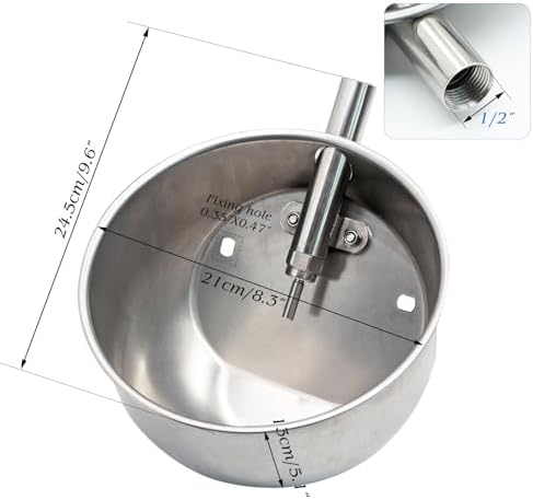 EASY INSTALL: Contacted with 1/2 inch water hose,diameter is about 20 mm. 2 holes at the bottom are convenient to hanging this hog waterer trough to the wall (screws are not included),more solid and practical.