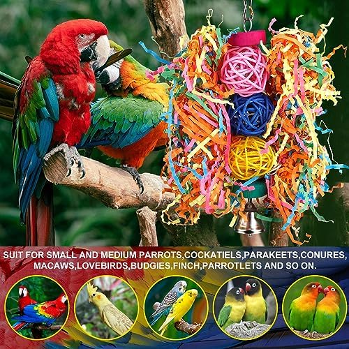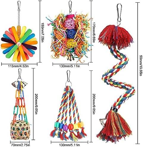 FORAGING AND SHREDDING STIMULATION: Coming a hanging hand-woven basket and rattan balls of confetti,brightly colored popsicle sticks,interesting plastics beads,the bird toys are designed to promote natural foraging and shredding instincts in birds, helps keep their beaks healthy and provides mental stimulation and prevent boredom.