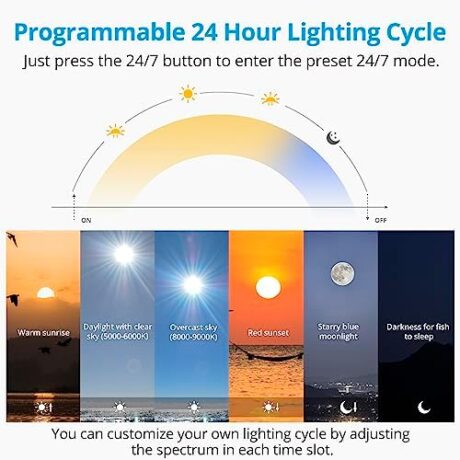 🌿HIGH-QUALITY LIGHT: The light is soft, the color rendering index is close to natural light, up to 85%, protecting eyes and fish, to refuse the discomfort caused by stroboscopic for fish and viewers. Using high-quality 2835 + 5050 model lamp beads, long service life, at least 50,000 hours. Lamp beads waterproof, the light is easy to clean and wipe, No need to worry even if it falls into the water briefly.
