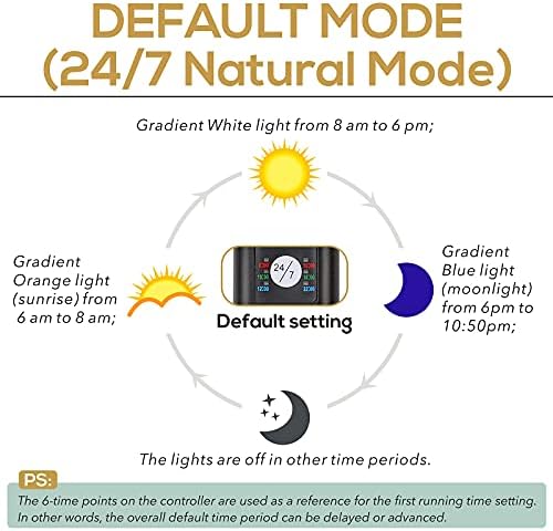 🐡DIY MODE: Time + Color + Brightness can be set. ①Setting time(TIMER key): There are 3 choices, it can run for 6 hours, or 10 hours, or 12 hours; ②Brightness(🔺/🔻 key): 5 kinds of brightness. ③Color(ON-OFF/ M key): White, Red, Blue, Green, Purple, Orange, Cyan, PS: The light slowly ramps up and down in 15 minutes, then comes the brightness you set. Cycle Color (No Brightness Selection).