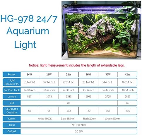[For 18-24 IN Tank] The 18“ freshwater aquarium light contains (56) 6500K White, (11) 450-455nm Blue, (7) 620-625nm Red, (4) 520-525nm Green, (20) RGB LED’s. 1075 lumens. 6500K. This system has adjustable mounting legs which can be used in aquariums with widths between 18 and 24 inches