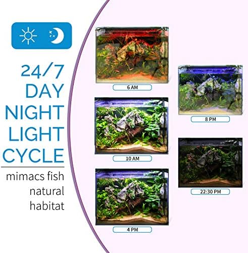 [24/7 Mode] This 24/7 fish tank light replicates the natural living conditions, starting with warm orange light at sunrise to 0bright full spectrum light at noon and starry blue light at nighttime, default light auto on at 6 AM and auto off at 22:50. Turn on/off time can be postponed or beforehand