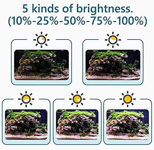 DIY MODE: Full spectrum aquarium light also can change the time + brightness + color. ①Setting time(TIMER key): 3 kinds of time, 6h, or 10h, or 12h; ②Brightness(🔺/🔻 key): 5 kinds of brightness. ③Color(ON-OFF/ M key): White, Red, Blue, Green, Purple, Orange, Cyan, Cycle Color (no brightness selection).