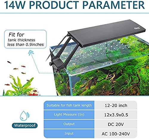 14W PRODUCT PARAMETERS: ①Power:14W; ②Led QTY:68PCS(White:32PCS/BLUE:12PCS/ RED:7PCS/GREE:3PCS/ RGB:14PCS); ③CRI:85; ④Application(for Fish Tnak long):12’’-20’’ ; ⑥Power Cord: 4.9ft+2.3ft; ⑦Input Votage:AC100-240V; ⑧Output Votage:DC20V; ⑨Kelvin: White 6500K, Blue 455nm, Red 620nm, Green 560nm; ⑩Lumens:817;