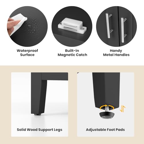 -Considerate Details- 1. Adjustable Shelf: The middle shelf inside the storage cabinet could be freely adjusted in order to accommodate items with different heights. (Five positions to set) And you could also leave it aside if you don’t want to use it. 2. Pine Wood Legs with Footpads: The footpads will avoid direct touch from the legs to the floor in order to protect your floor from scratches. 3. Waterproof Surface: Treated with waterproof painting, it’s easy for you to keep it clean.