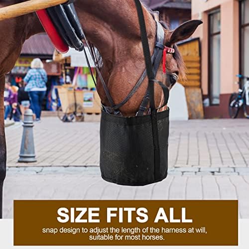 Proper Size: the feed bag is approx. 9.5 x 9 inch (D x H), featuring adjustable strap with quick clip and sturdy buckle, and the clip design can adjust the strap length to fit most horses, proper size allows your horse to breathe comfortably, preventing excessive accumulation of water in feed bags and the waste of feed