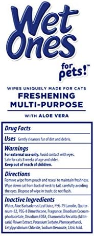 Wet Ones for Pets Freshening Multi-Purpose Wipes for Cats are designed with your pet in mind for a quick, gentle, & healthy clean anytime, anywhere! These cat wipes for bathing are the perfect solution for a quick and easy refresh for your furry friend without the fuss of a traditional bath. Cat bath wipes from Wet Ones are formulated with soothing aloe vera to help moisturize your cat’s skin and leave behind a soft and healthy, glowing coat. Cat grooming wipes from Wet Ones are infused with a light fresh scent fragrance to ensure your cat always smells fresh and clean! Directions: 1. Remove wipe from canister and reseal to maintain freshness. 2. Wipe down cat from back of neck to tail, carefully avoiding the eyes. 3. Dispose of wipe in trash, do not flush. 4. Play on! Inactive Ingredients: Water, Aloe Barbadensis Leaf Juice, PEG-75 Lanolin, Quaternium-52, PEG-8 Dimethicone, Fragrance,Disodium Cocoamphodiacetate, Disodium EDTA, Chamomilla Recutita (Matricaria) Flower Extract,Potassium Sorbate, Phenoxyethanol, Cetylpyridinium Chloride, Sodium Benzoate, Citric Acid. WARNINGS: For external use only. Safe for cats 8 weeks of age and older. Avoid contact with eyes. Keep out of reach of children. Distributed by Fetch for Pets New York, NY 10018 USA Made in China WET ONES is a trademark of Edgewell Personal Care Brands, LLC and is used under license. 2020 Edgewell. YOUR SATISFACTION IS OUR PRIORITY: If you have any questions or feedback, please reach out to us at Fetch for Pets.